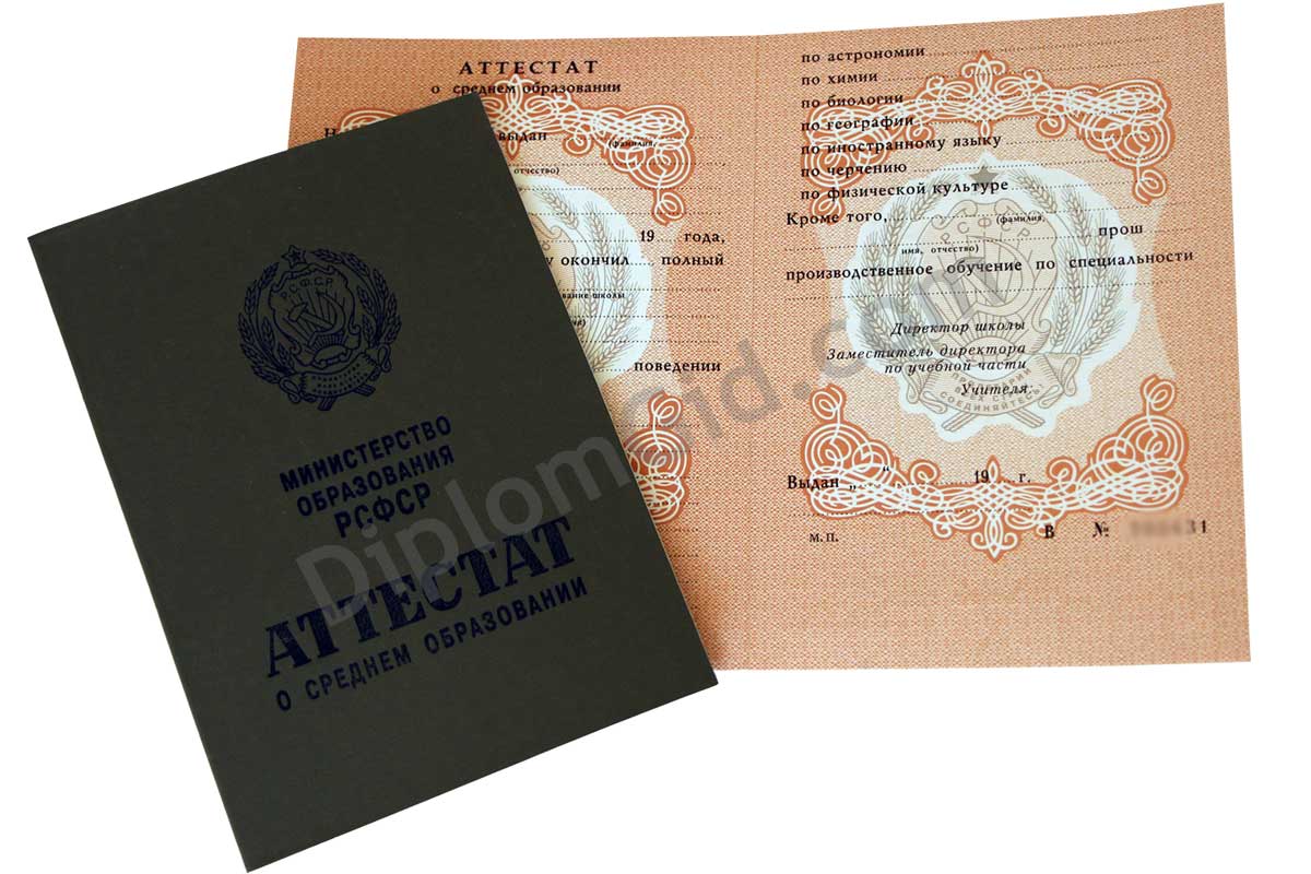 Аттестат школы об окончании 11 или 10 классов старого образца СССР с выдачей до 1994 года. Имеет советскую символику, заполняется по стандартам того времени, заверяется гербовой печатью РСФСР, подписью директора и других ответственных лиц. Аттестат как в школе!